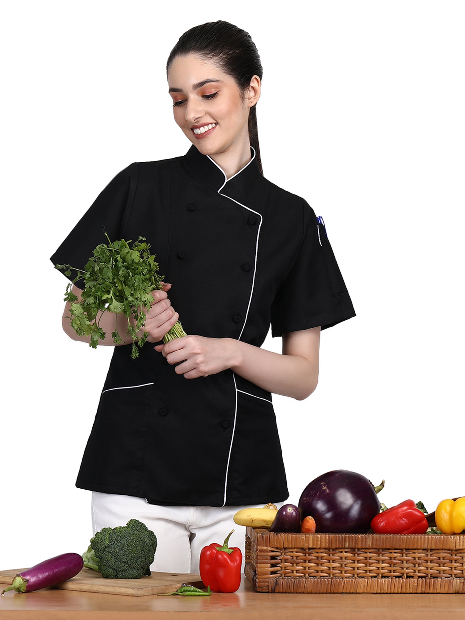 Short Sleeves Tailored Fit Chef Coat Jacket Uniform for Women for Food Service, Caterers, Bakers and Culinary Professional – Black - XS